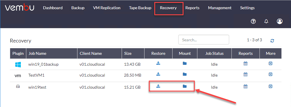 Now that we have a good backup of the server with Vembu, let’s look at the options for P2V we get. Choose the Recovery menu. The win19test machine is my physical Windows Server. Note the Restore and Mount options. You get these same options for any Vembu backup you have saved.