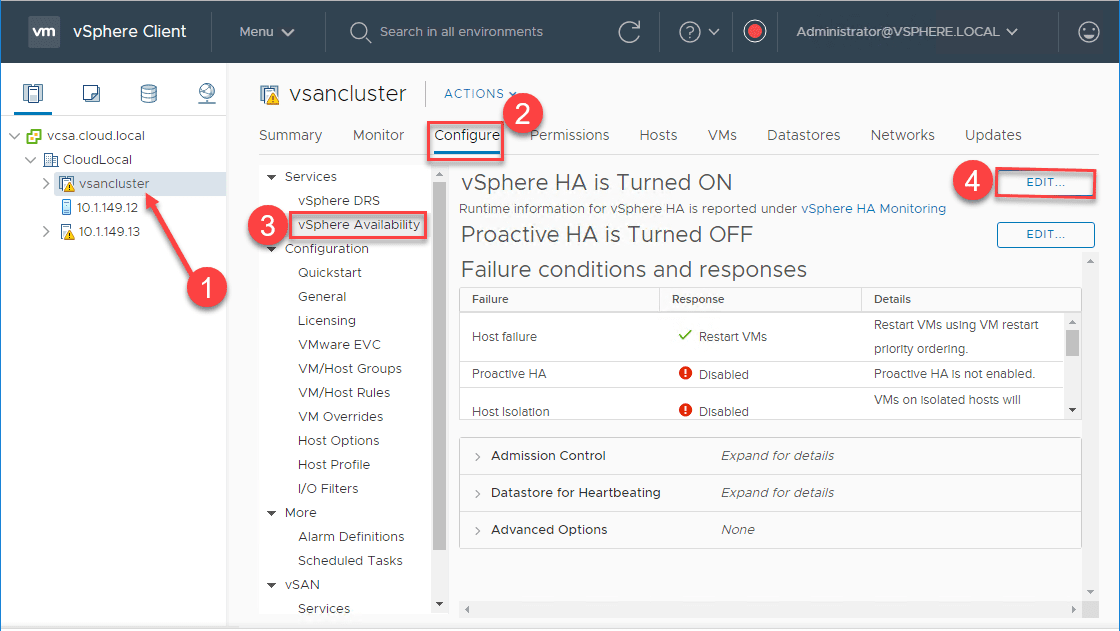 Navigate to the Cluster settings > Configure > Services > vSphere Availability > Edit