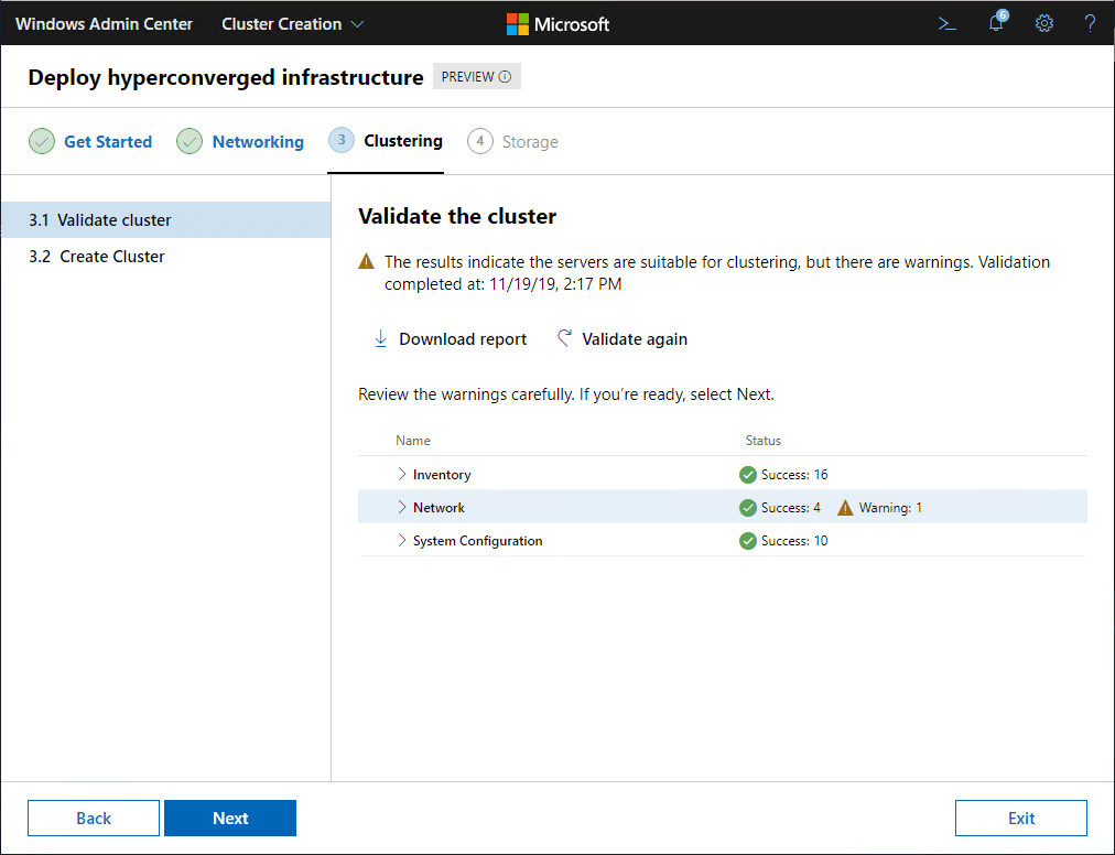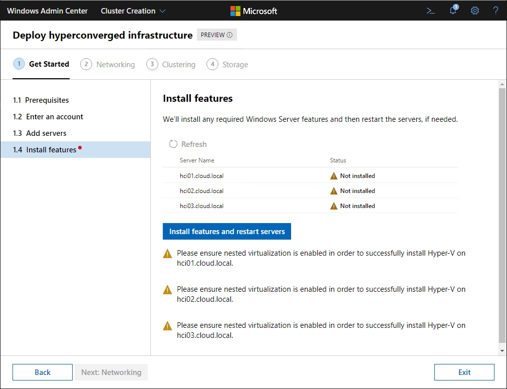 One surprise to me was the fact the wizard actually realized I was using VMs as the “hosts” for the cluster creation. It noted that I needed to ensure nested virtualization is enabled in order to successfully install Hyper-V on each host.