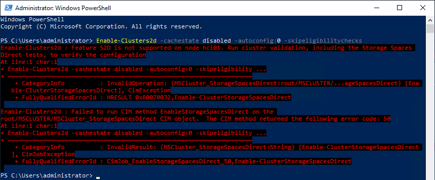 Sure enough, trying to enable S2D from PowerShell results in a not supported error.