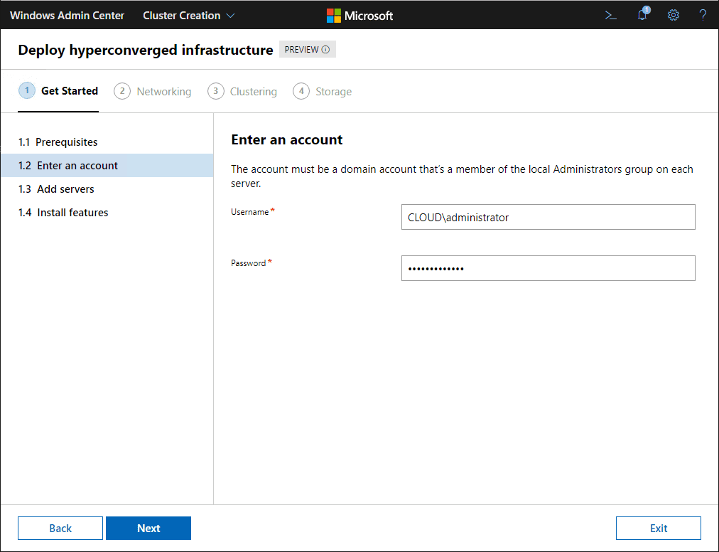In Section 1, you are giving the wizard all the information it needs to connect to the prospective hosts, install required features, etc. First up, enter an account to connect to the cluster hosts.