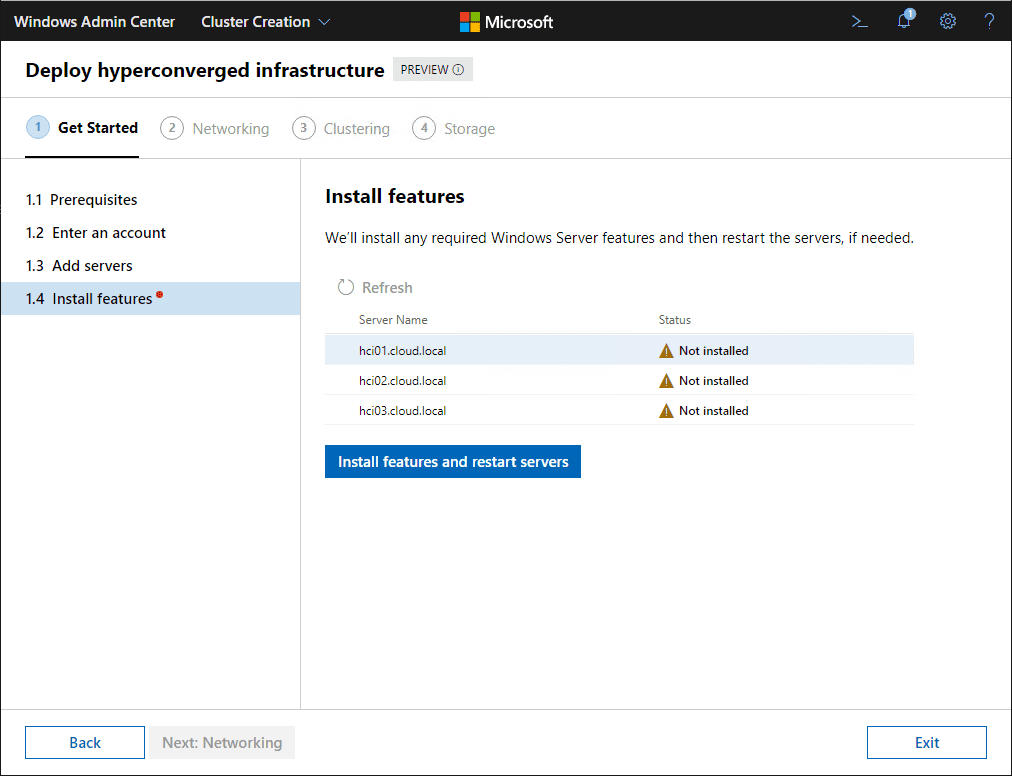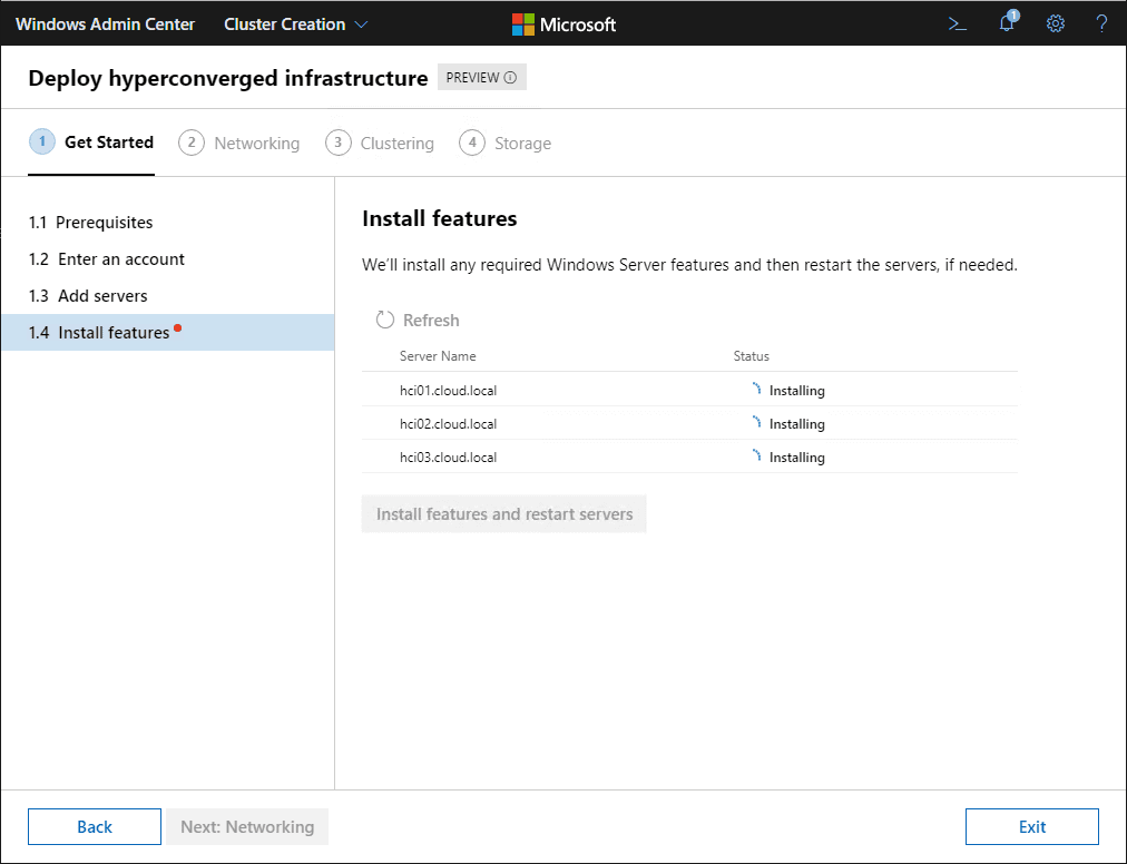 The Install features screen 1.4 is where you install all the required components including Hyper-V. Click Install features and restart servers.