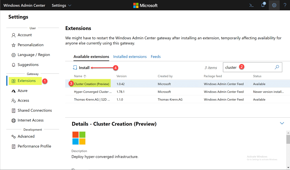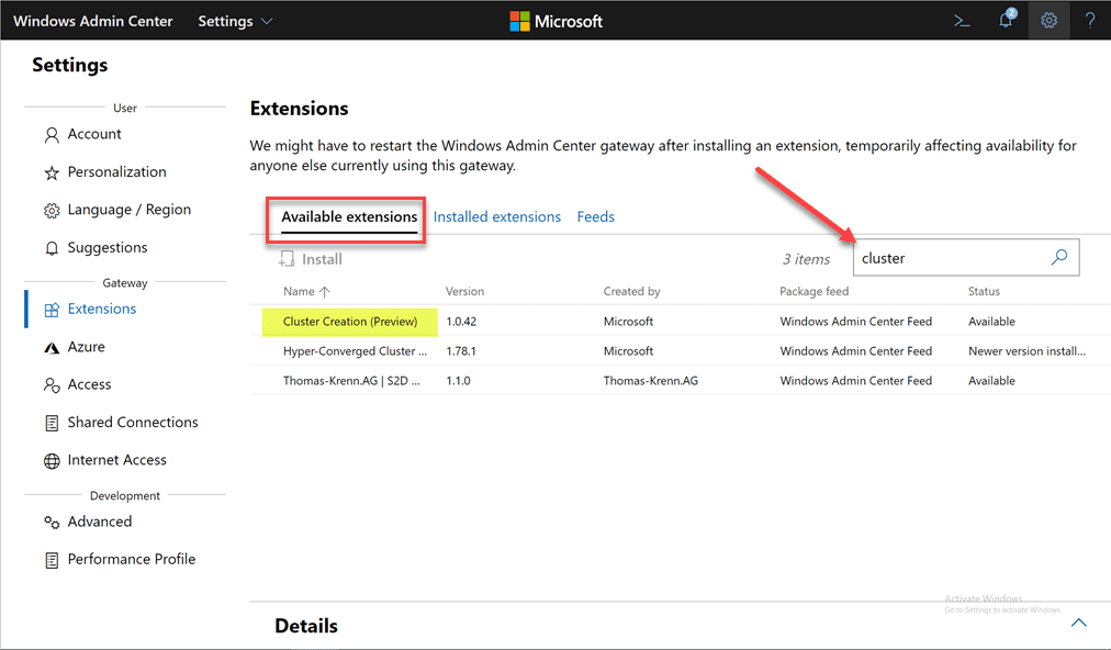 The Extension couldn’t be easier to install in Windows Admin Center. You simply go to the Settings in WAC, search for the extension (which is in Preview), and install it.