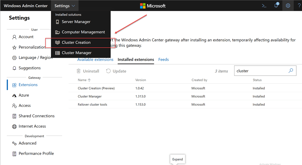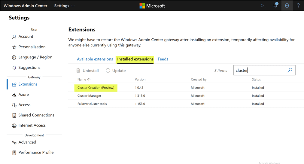 It should install fairly quickly. To verify it is installed, click teh Installed extensions tab and you should see the Cluster Creation (Preview) listed.
