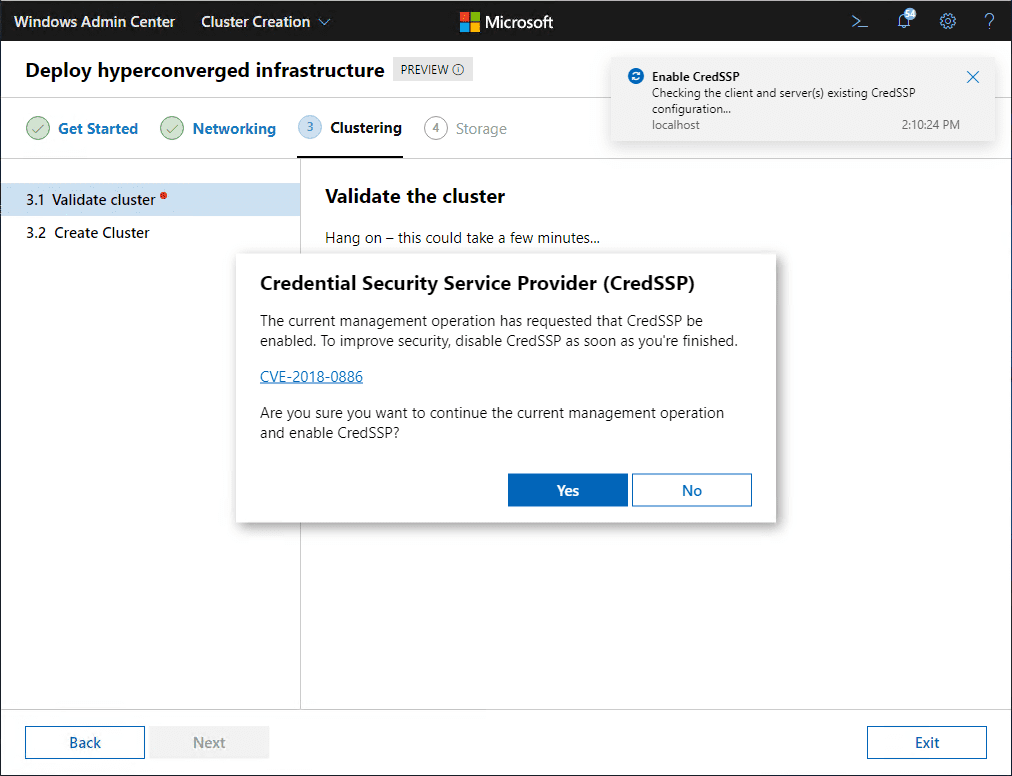 Interestingly, you have to enable CredSSP for the wizard. Click Yes.