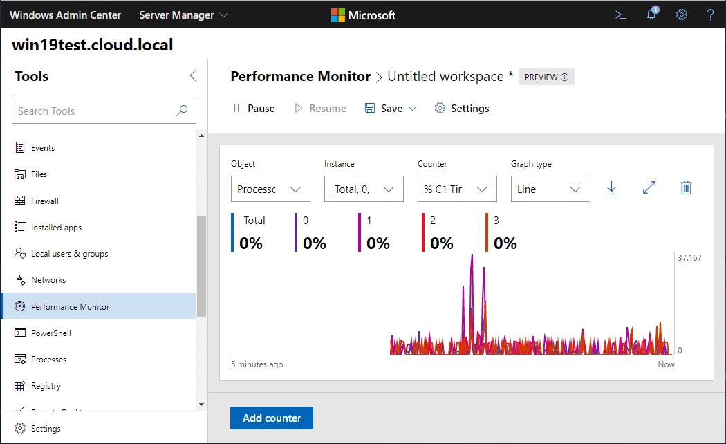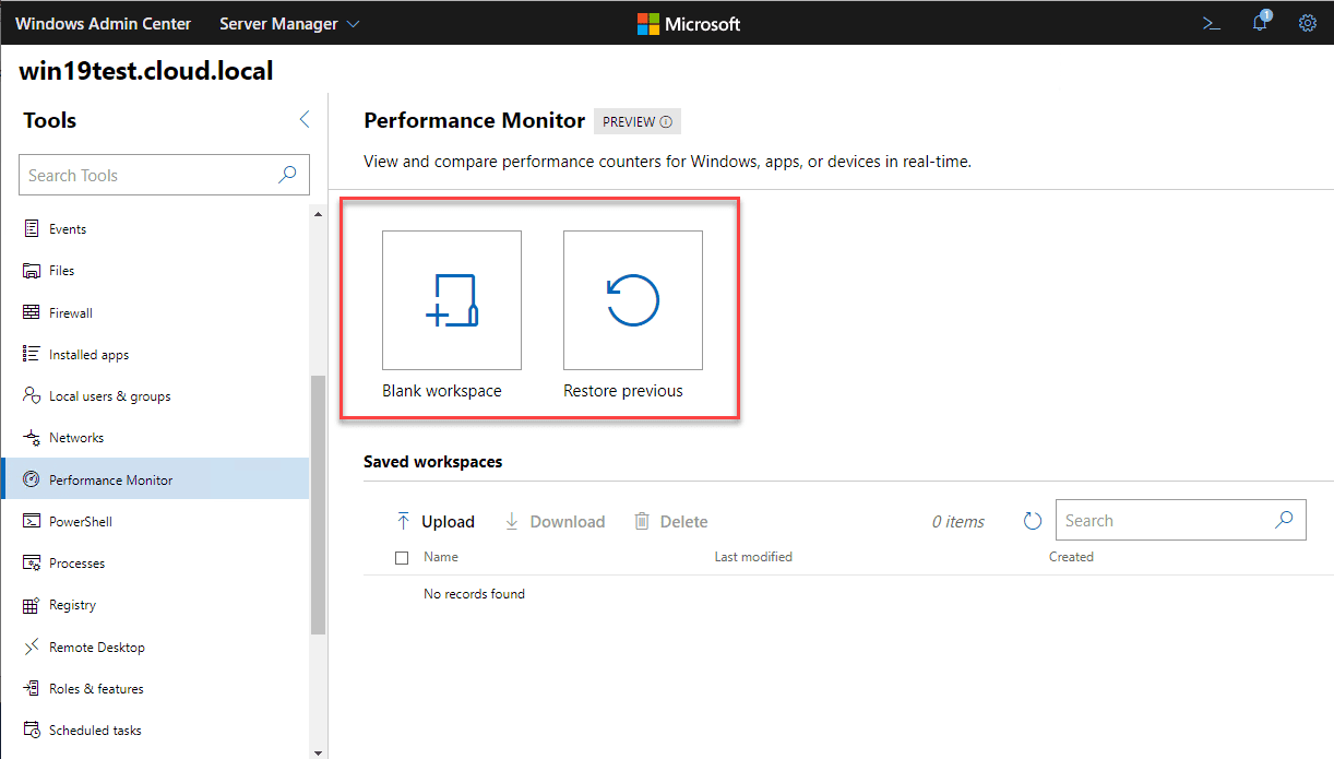 The new performance monitor introduces the new concept of workspaces. Workspaces save the layout and monitors that you have configured inside the Performance Monitor dashboard within Windows Admin Center. This allows you to easily return to a specific view you had developed in Performance Monitor. Workspaces can be downloaded and even saved.