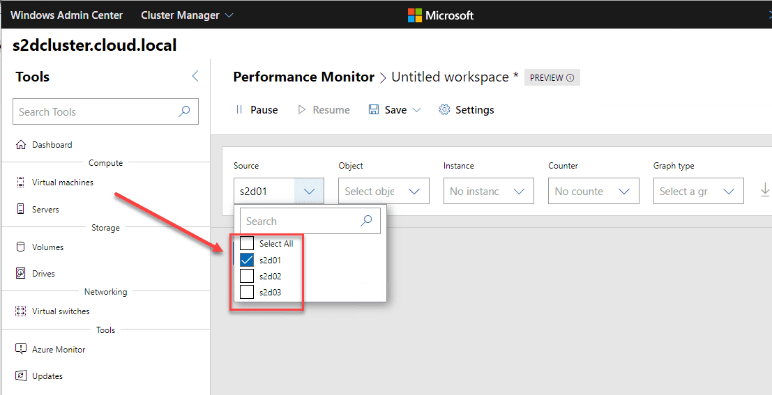When you have a cluster added to the new Windows Admin Center, Performance Monitor gives you to the option for Sources to select All, or specific cluster hosts.