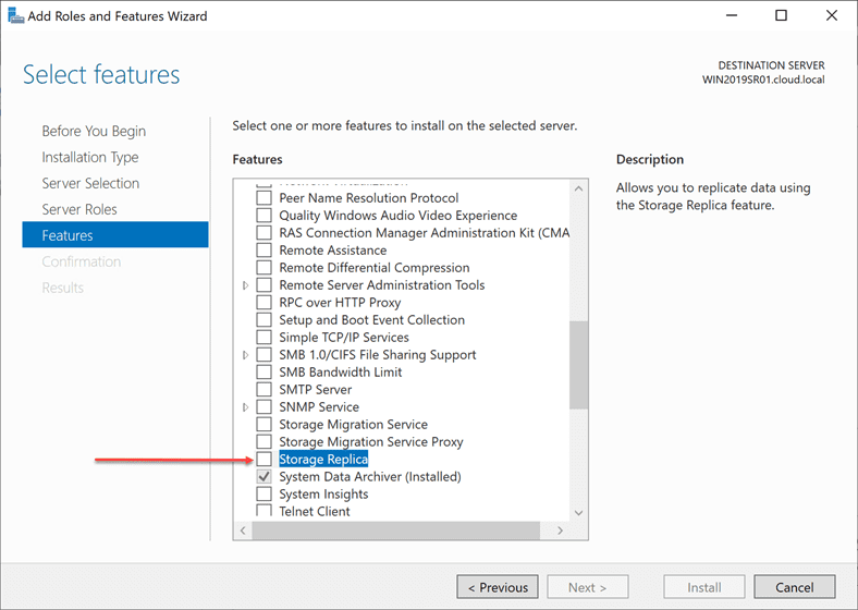 Below, using Server Manager in Windows Server 2019, Check off the Storage Replica feature for installation.