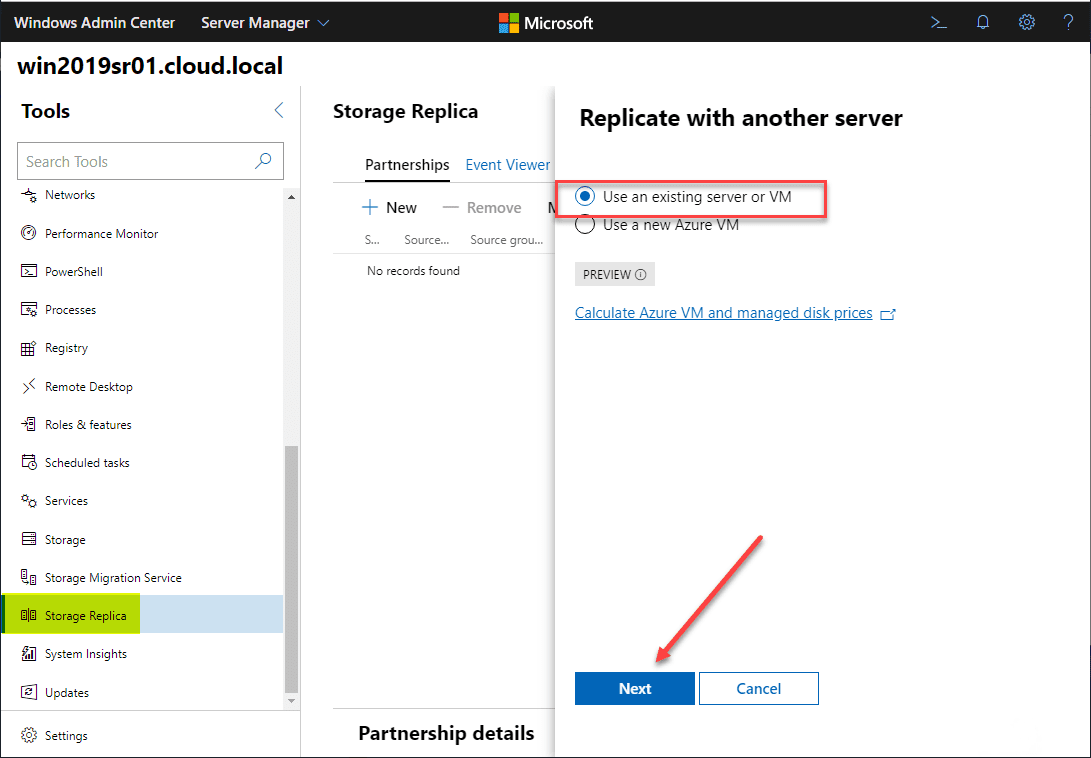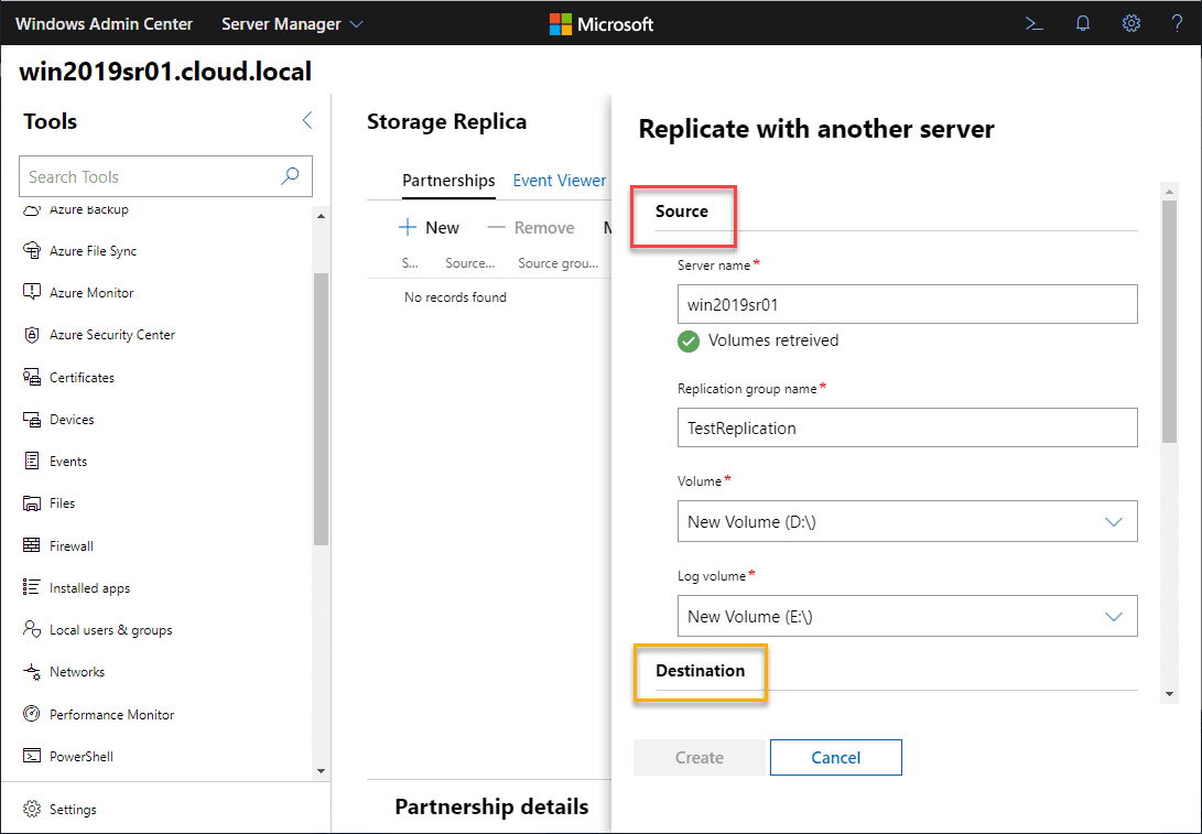 Now that Storage Replica is installed, I have also installed Windows Admin Center 1910 for easily configuring the Storage Replica feature. Navigate in Windows Admin Center to Storage Replica and select the New under Storage Replica Partnerships.