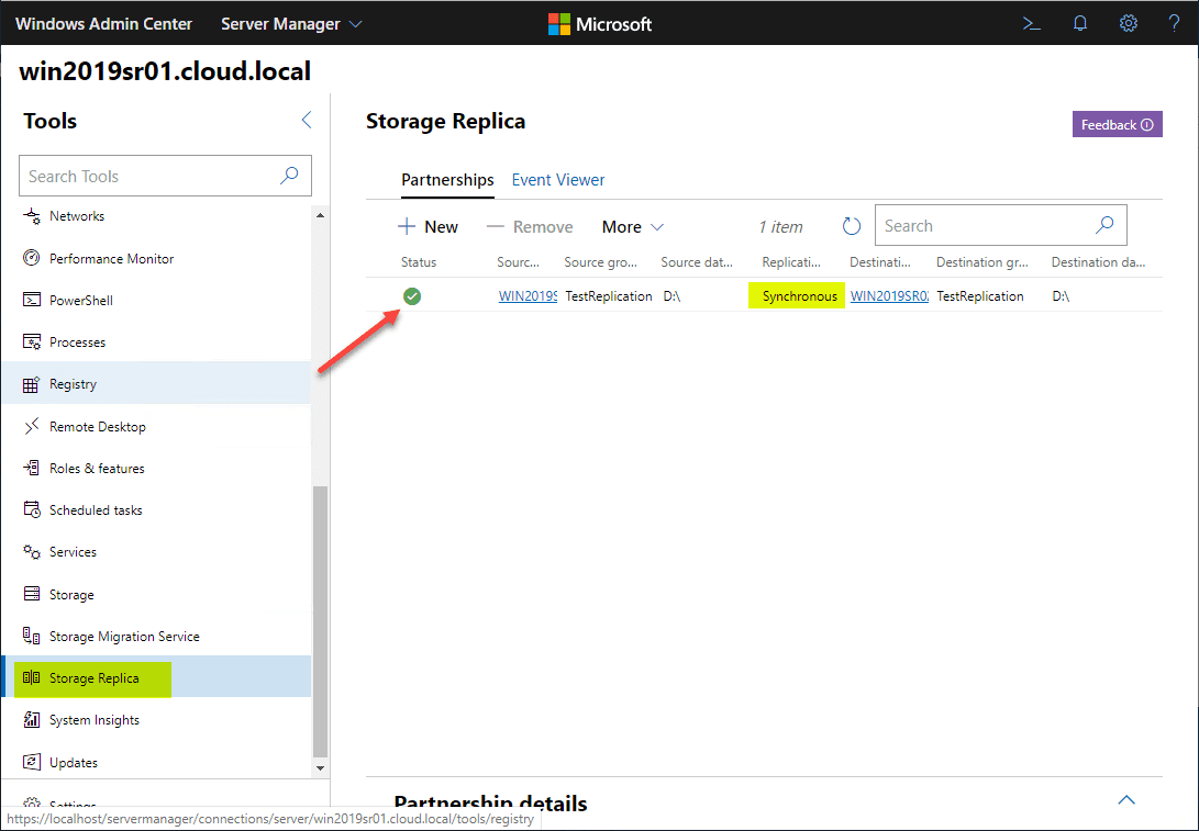 After a couple of moments, the Storage Replica partnership is created.