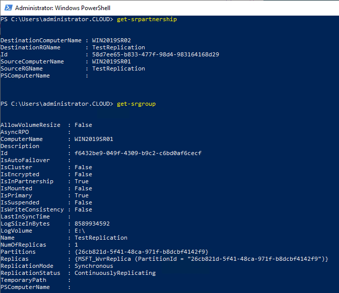Get-SRGroup do{ $r=(Get-SRGroup -Name "Replication 2").replicas [System.Console]::Write("Number of remaining bytes {0}`n", $r.NumOfBytesRemaining) Start-Sleep 10 }until($r.ReplicationStatus -eq 'ContinuouslyReplicating') Write-Output "Replica Status: "$r.replicationstatus