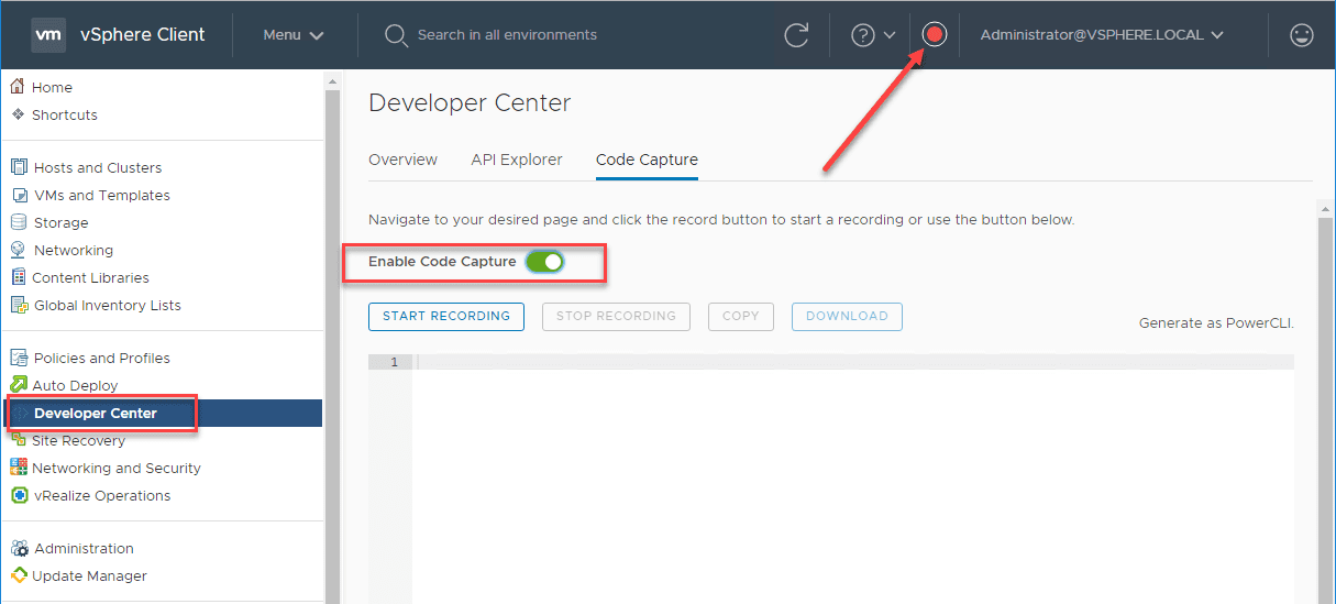 A great new feature that is found in the vSphere Client interface is the Code Capture feature. This is a component of the Developer Center now found in the vSphere Client interface. This allows you to record your actions and series of actions and then have PowerCLI code automatically generated for you which is super cool.