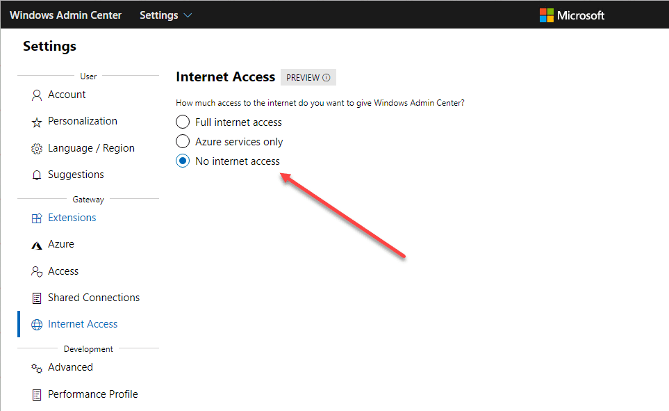 A nice little feature that was added in this release is the ability to control how much Internet access you give to Windows Admin Center itself. You can control which types of connectivity WAC has to the outside world. There are three options available in the Internet Access area of your Settings.
