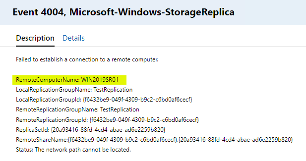 Failed to establish a connection to a remote computer. RemoteComputerName: WIN2019SR01 LocalReplicationGroupName: TestReplication LocalReplicationGroupId: {f6432be9-049f-4309-b9c2-c6bd0af6cecf} RemoteReplicationGroupName: TestReplication RemoteReplicationGroupId: {f6432be9-049f-4309-b9c2-c6bd0af6cecf} ReplicaSetId: {20a93416-88fd-4cd4-abae-ad6e2259b820} RemoteShareName:{f6432be9-049f-4309-b9c2-c6bd0af6cecf}.{20a93416-88fd-4cd4-abae-ad6e2259b820} Status: {Network Name Not Found} The specified share name cannot be found on the remote server.