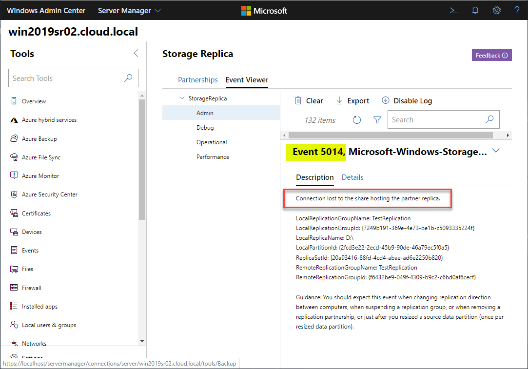 Connection lost to the share hosting the partner replica. LocalReplicationGroupName: TestReplication LocalReplicationGroupId: {7249b191-369e-4e73-be1b-c5093335224f} LocalReplicaName: D: LocalPartitionId: {2fcd3e22-2ecd-45b9-90de-46a79ec5f0a5} ReplicaSetId: {20a93416-88fd-4cd4-abae-ad6e2259b820} RemoteReplicationGroupName: TestReplication RemoteReplicationGroupId: {f6432be9-049f-4309-b9c2-c6bd0af6cecf}