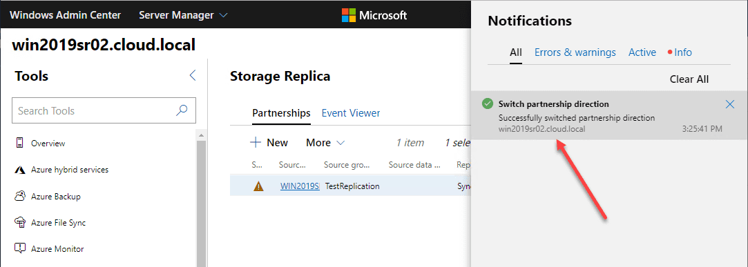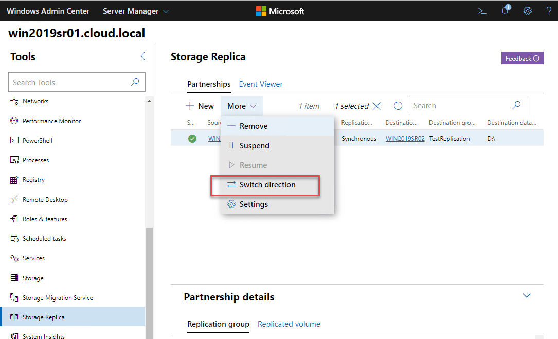 Failing over in Windows Server 2019 Storage Replica is super simple. It simply involves the Switch direction function found under the More menu for Storage Replica in Windows Admin Center.