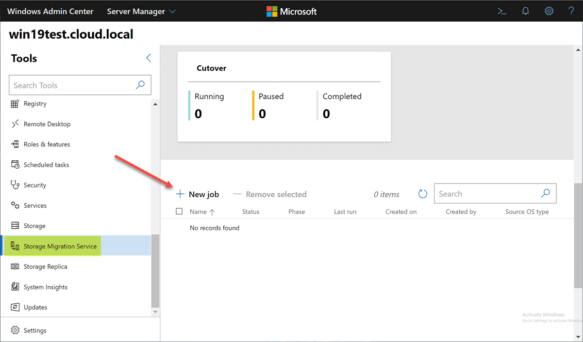 Beginning the Storage Migration of Windows Server 2008 to 2019 by clicking the New Job button.
