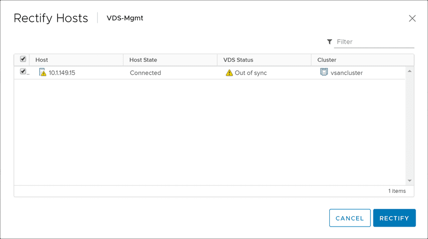 You can click the Rectify link to attempt to rectify the configuration issue. I tried this however, knowing it would most likely not work. It didn’t. This is because, the host is really different. Your vCenter Server will still see it as the old ESXi host that already has the VDS switches added to the host. However, they are not.