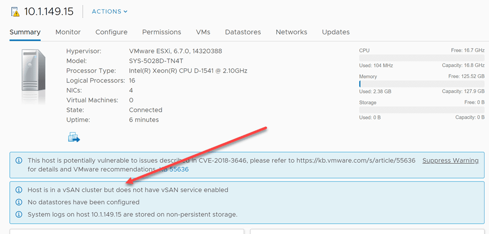 After getting the ESXi host networking squared away with the VDS now properly added and the VMkernel port configured back to the ESXi host, I still saw the following error, “Host is in a vSAN cluster but does not have vSAN service enabled“. If you Google this error, you will see most talking about not having a VMkernel port configured on the ESXi host that is enabled for vSAN. However, I had this configured correctly and could vmkping between hosts correctly and so on. However, I remembered, the vSAN cluster still had the old reference to the ESXi host.