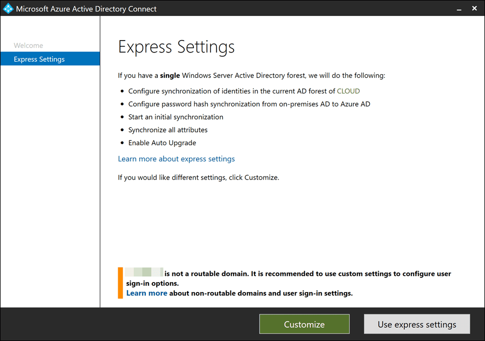You may also see a warning about a routable domain if you are using a .local or some other domain as I am in the lab environment. Keep in mind you will need to be able to synchronize a domain with the same UPN suffix both on-premises and in your Azure AD environment or the synchronization between them will not work.