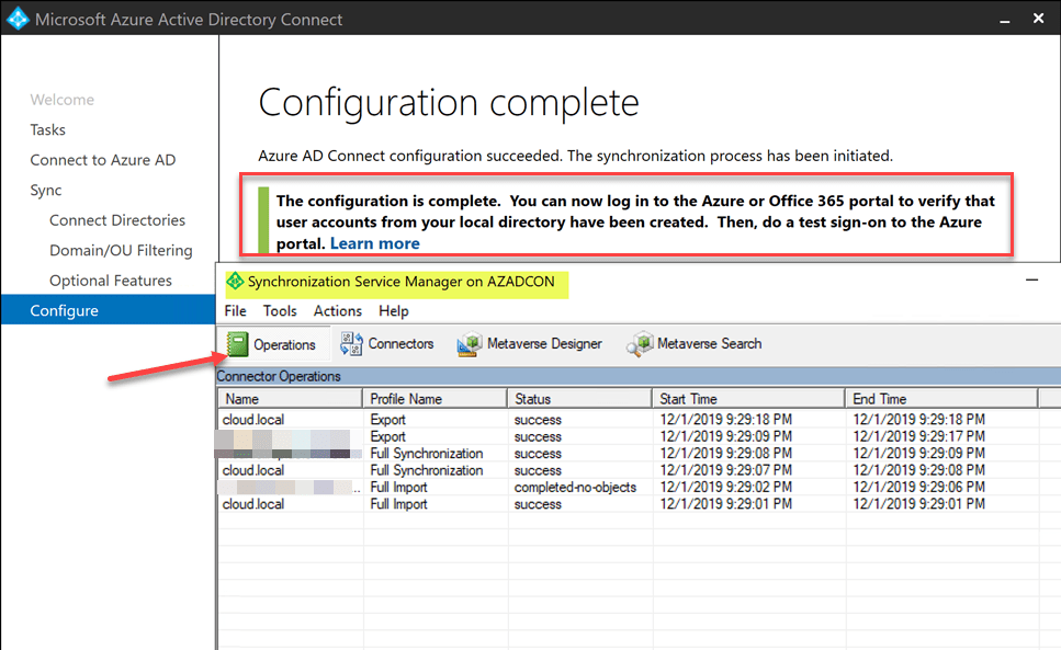 I have it overlaid on top of the Azure Active Directory Connect tool. As you can see, you can click the Operations button and see the current operations as they complete in the process.