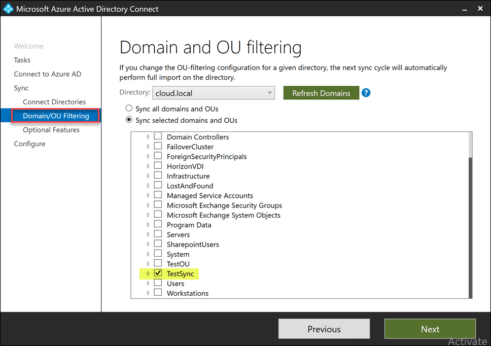 If you want to reconfigure any of the settings you may have chosen in the initial setup and configuration, just relaunch the Azure Active Directory Connect tool and choose to Configure. Here I am configuring the Domain/OU Filtering options. This allows you to scope down the OUs/users that you want to synchronize between on-premises and Azure AD.