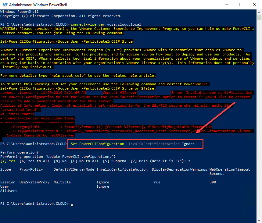 To work around this, there is a PowerCLI cmdlet we can use to ignore the certificate errors.