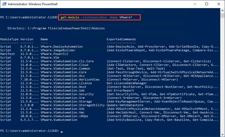 After the install completes, you can use the get-module cmdlet to view the VMware module components and versions you have installed.