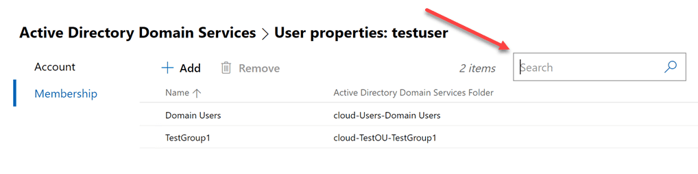 Also, if you look at the Membership menu, you will quickly get to see which groups the user object is a member of. Additionally, I really like the search menu that is found on these pages that allows quickly filtering down to see the exact object you are looking forward. Instead of having to scroll through a list of groups in the user properties like ADUC, you can quickly use the search menu and determine if the user is a member of a particular group or not.