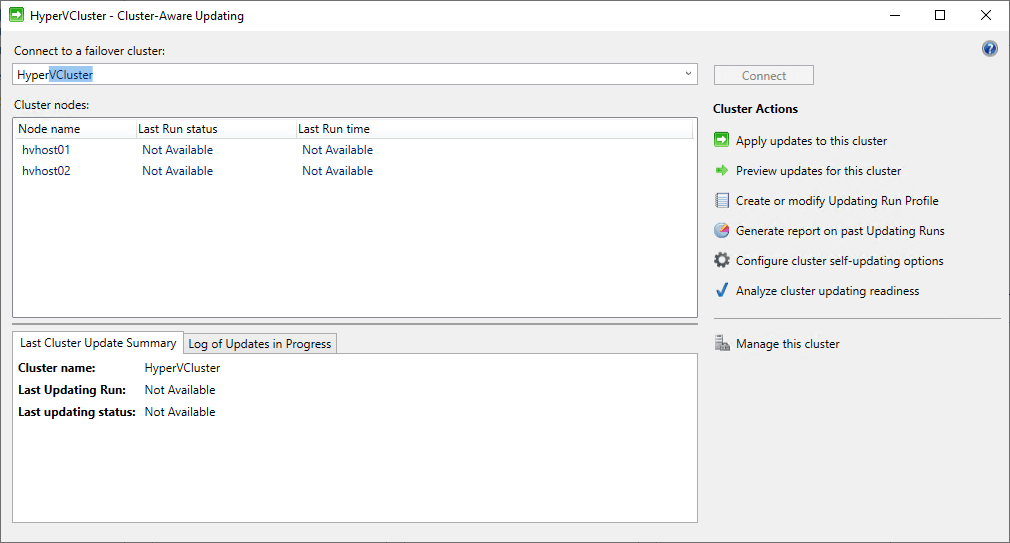 Remote-updating mode – In this mode a separate remote machine, an Update Coordinator, is configured with CAU tools. It is not a member of the cluster itself, however, it coordinates the update process and can be used to monitor the process in real-time.