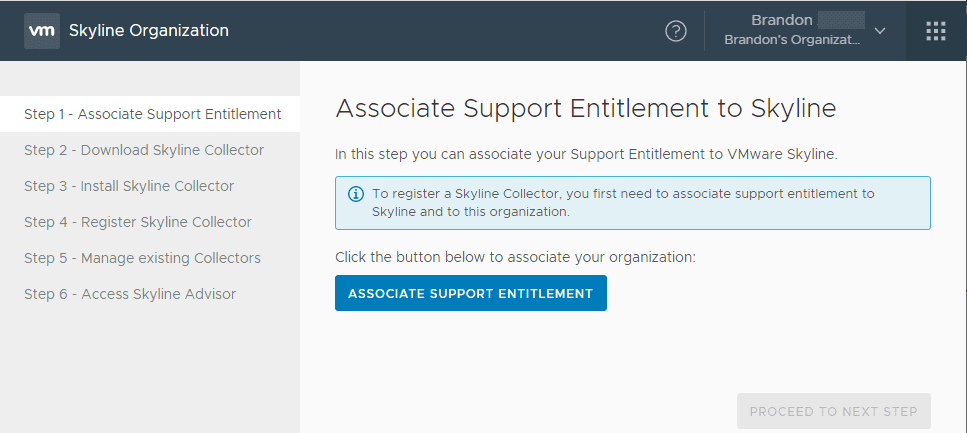 This begins a Six Step wizard that walks you through setting up the cloud portion of VMware Skyline. First, you will need to Associate Support Entitlement to your Skyline environment.