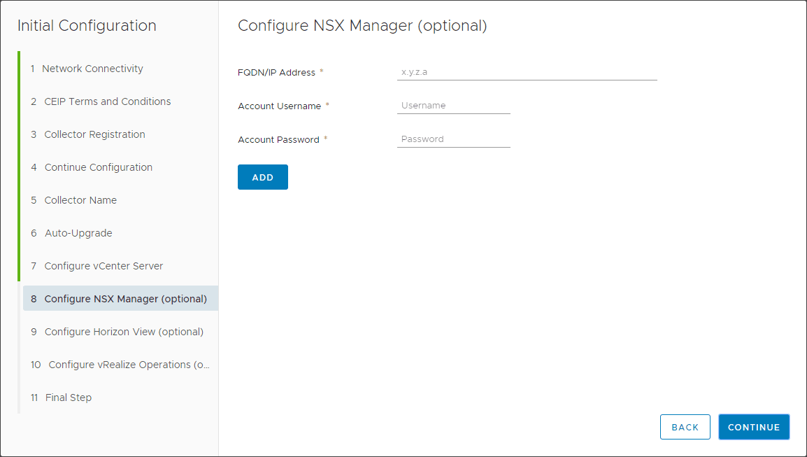 Next, connect to VMware NSX in your environment (optional). Currently, this only supports NSX-V (from what I can tell).