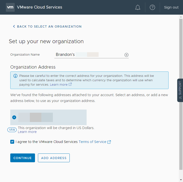 VMware Cloud has the concept of organizations. If you haven’t already set this up, you will be prompted to setup an organization to start configuring your VMware Skyline environment.