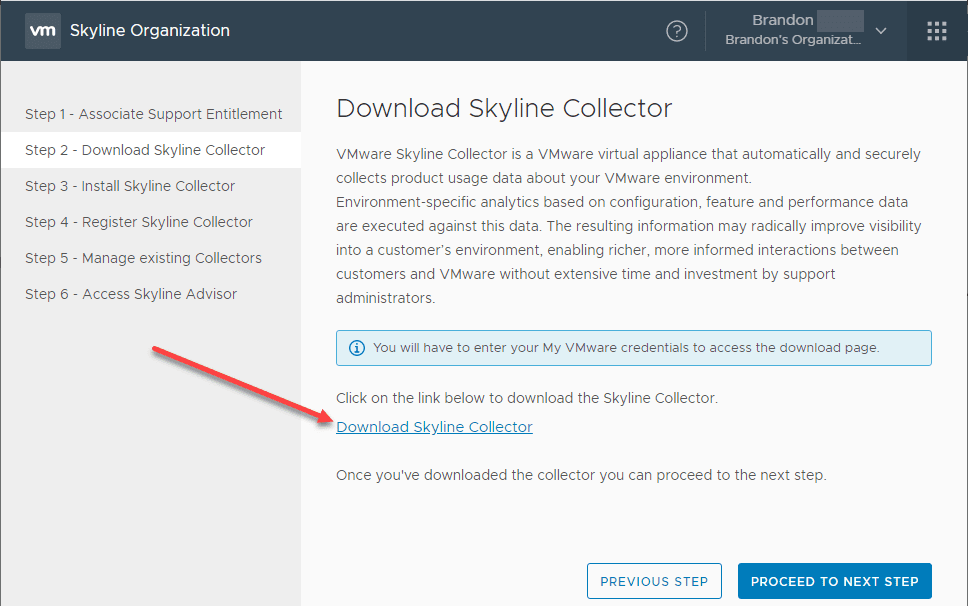 Download the VMware Skyline Collector. At the time of this writing, version 2.3.0.2 is available for download. It is around 585 MB which is small by today’s standards.