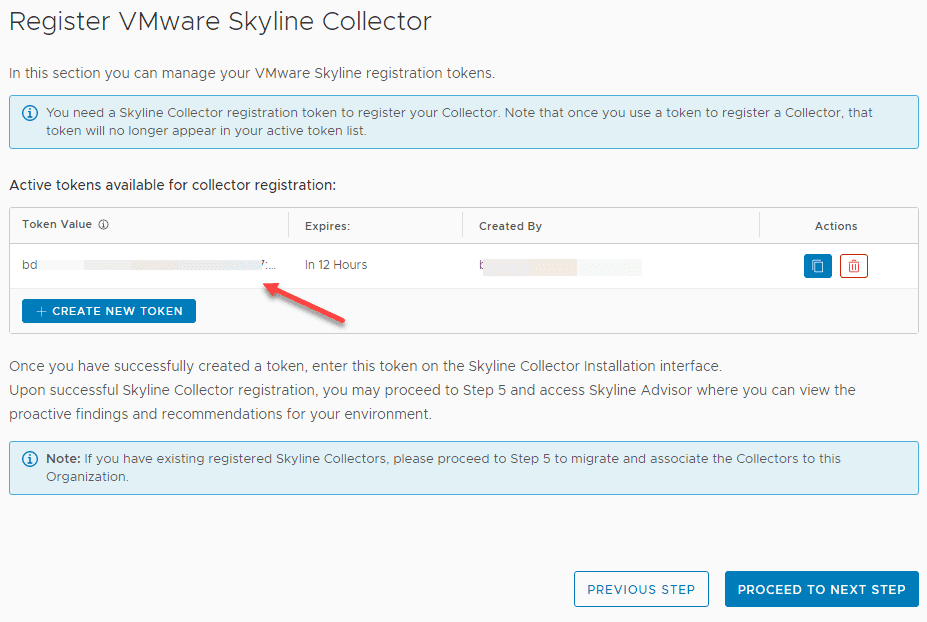 Going back to the VMware Cloud side, click the Create New Token button on Step 4 – Register Skyline Collector.