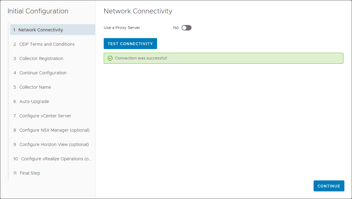 This will launch the Initial Configuration of the Skyline Collector appliance. The first thing it has you do is Test connectivity.