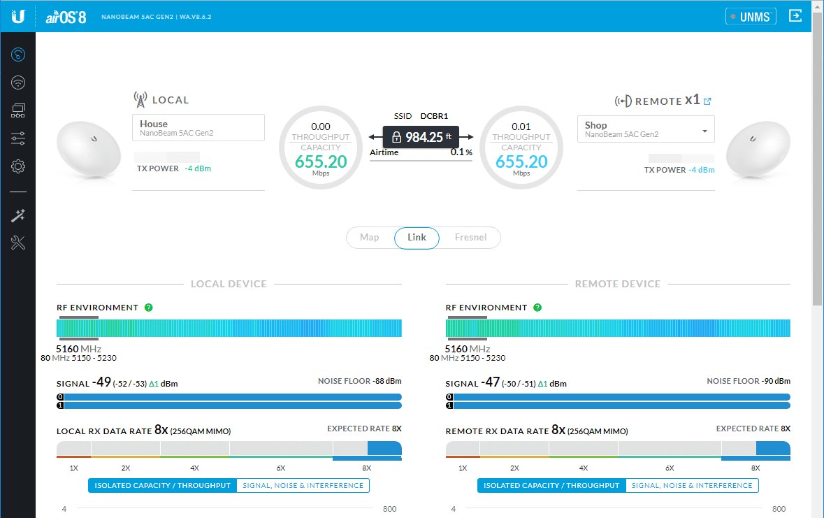 As you can see below, I have the house as the primary and the shop as secondary. Signal strength is good and throughput is as well.