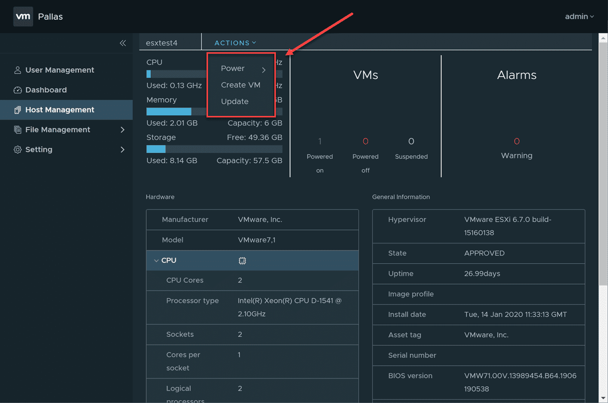 If you click the name of your ESXi host under Host Management, it will take you to the overview of the host. You will see the health, hardware, VMs, Alarms, and other general information displayed. Additionally, you have an Actions menu. Under this menu, there is a Power, Create VM, and Update action you can perform.