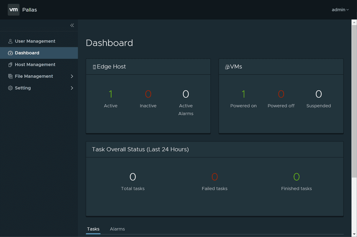 Now that we have a host approved, you can see the host showing up in the dashboard, along with the running VMs displaying on the host. If you notice at the bottom, you also have the Tasks and Alarms available to you.