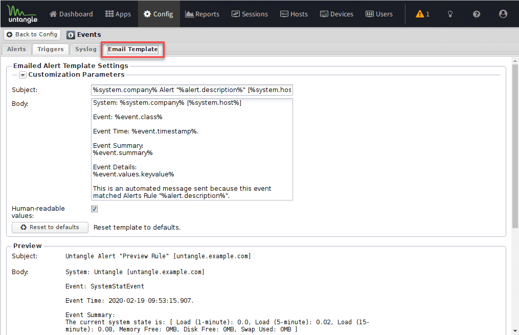 A look at the new email template tab that allows customizing the email alerts for certain events.