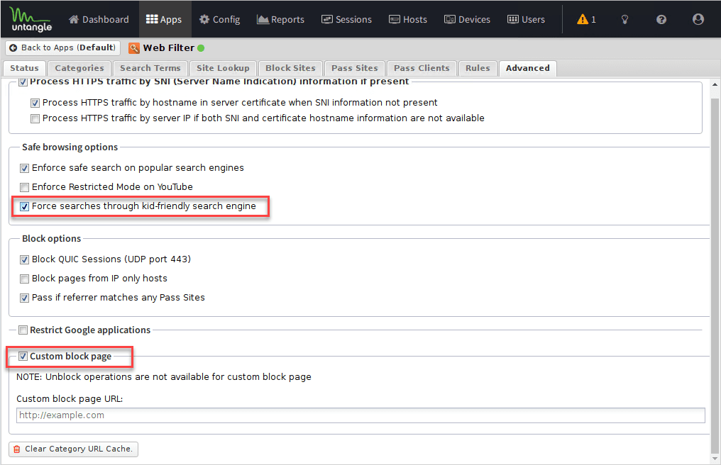 Under the Advanced settings for the Web Filter, you see the new Force searches through kid-friendly search engine as well as the Custom block page.