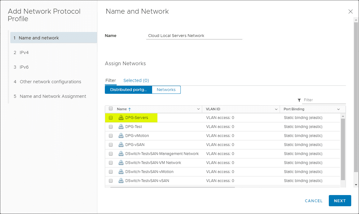 This starts the Add Network Protocol Profile wizard. The first step in the wizard is to select the network you want to be associated with your Network Protocol. The “network” here being the vSwitch portgroup, either vSphere Distributed Switch port groups or vSphere Standard Switch portgroups can be attached.