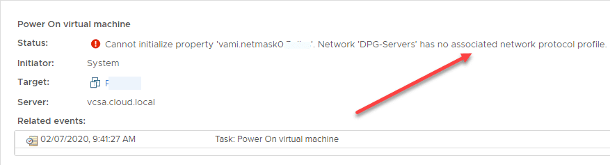 You may see an error such as Network <Network name> has no associated network protocol profile.