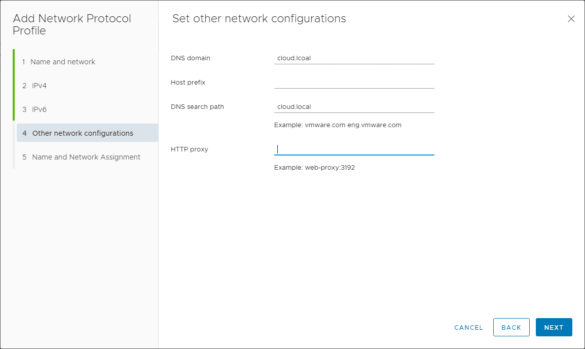 Set other network configurations like DNS domain, Host Profile, DNS search path, and HTTP proxy.