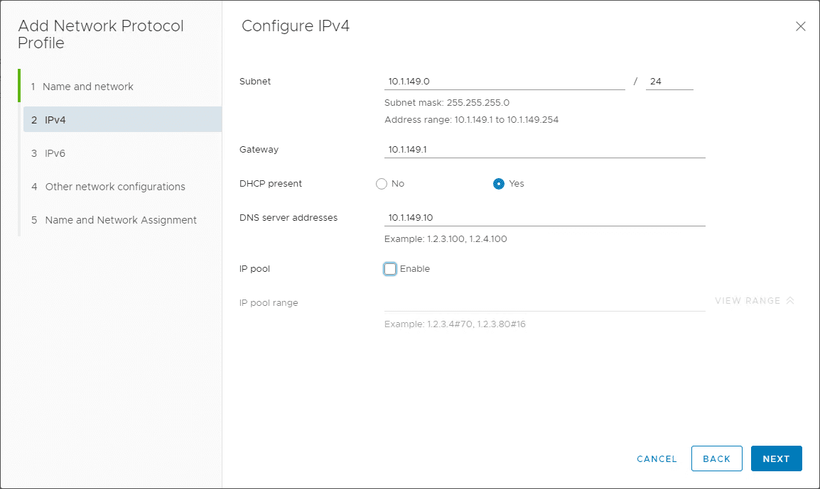 To create an IP Pool, you create a Network Protocol Profile. To get to this area, click on your datacenter in the hosts and clusters view. Click Configure > Network Protocol Profiles > Add.