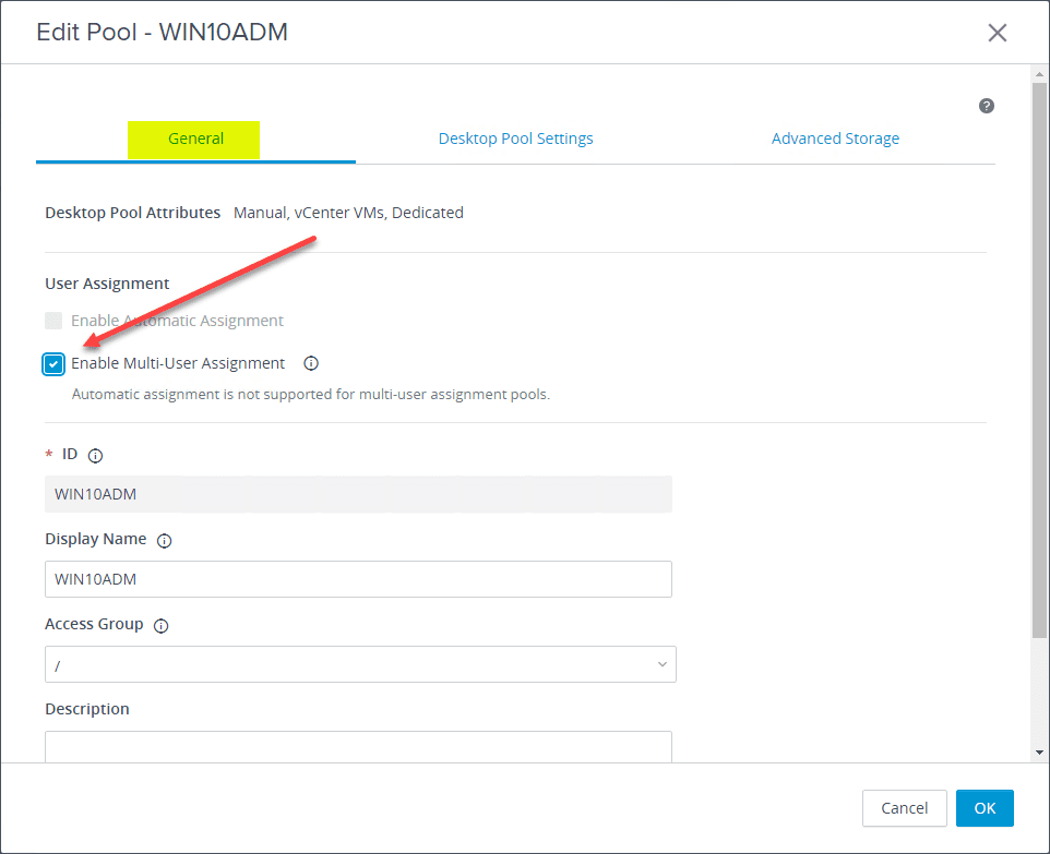 Let’s now take a quick look at how to assign multiple users to a single manual desktop pool that may contain even a single desktop machine. There are a couple of settings that we want to enable to make this available.