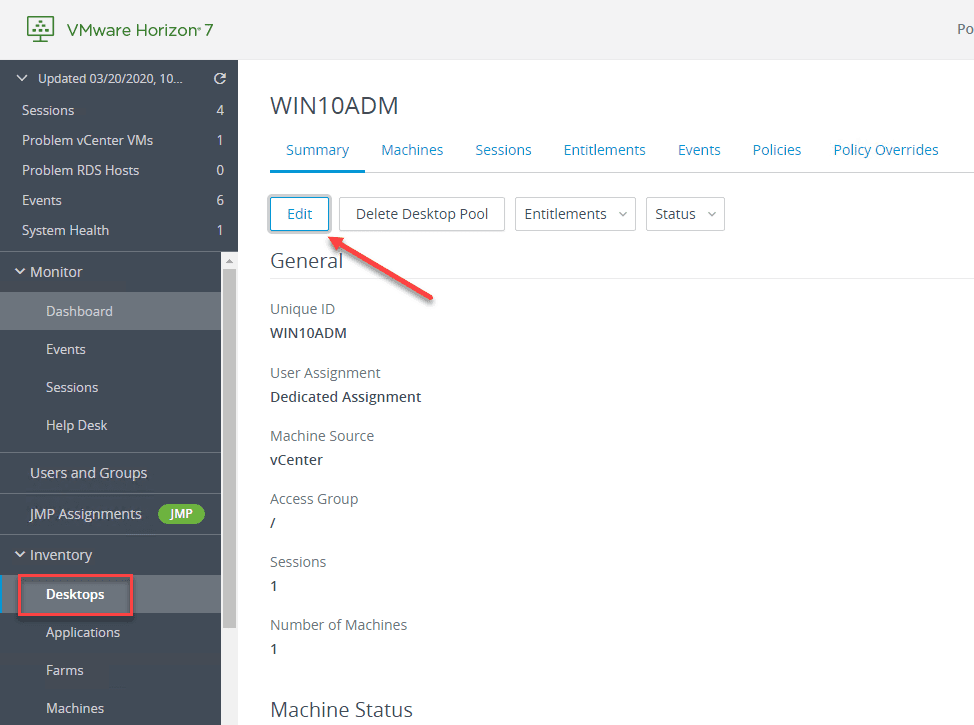 The first setting is configured on the desktop pool itself. This is to set the multi-user assignment. To configure this setting, navigate to Inventory > Desktops, and then Edit the desktop pool.
