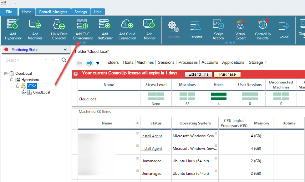 Adding your VMware Horizon 7 EUC VDI environment to your ControlUp 8.1 management platform is easy. Simply click the Add EUC Environment button.