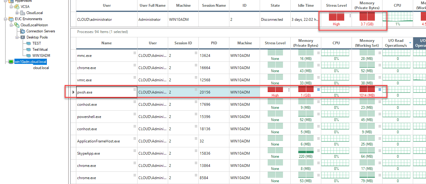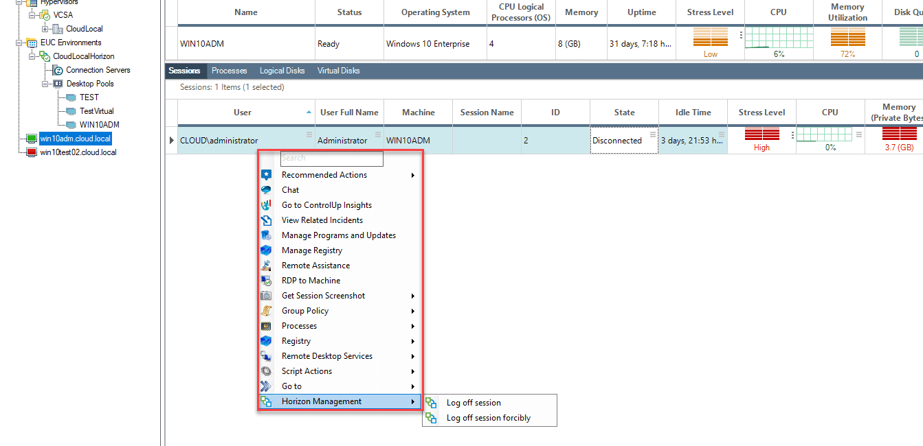 As simple as that, you have connected to your VMware Horizon 7 EUC environment and ControlUp 8.1 will begin telling you the health of the environment. ControlUp has a very easy to read Stress Level overall metric that allows quickly assessing the VMware Horizon environment for any potential “hotspots” or issues.
