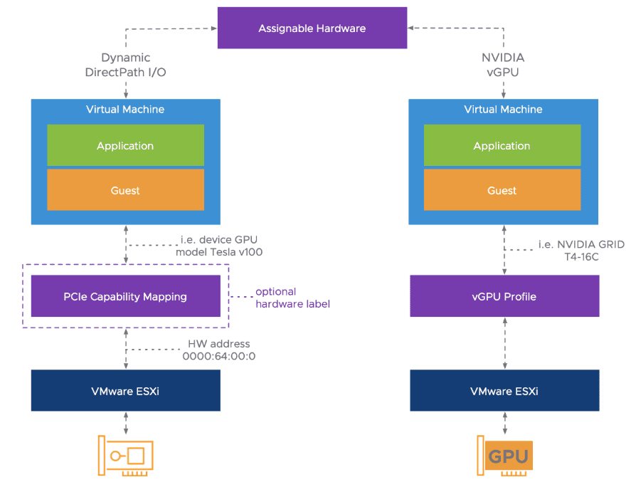 With VMware vSphere 7 assignable hardware provides a means that is flexible to assign hardware accelerators to workloads. It identifies the hardware accelerator by attributes of the device rather than by its hardware address. This provides an abstraction layer for the PCIe device.